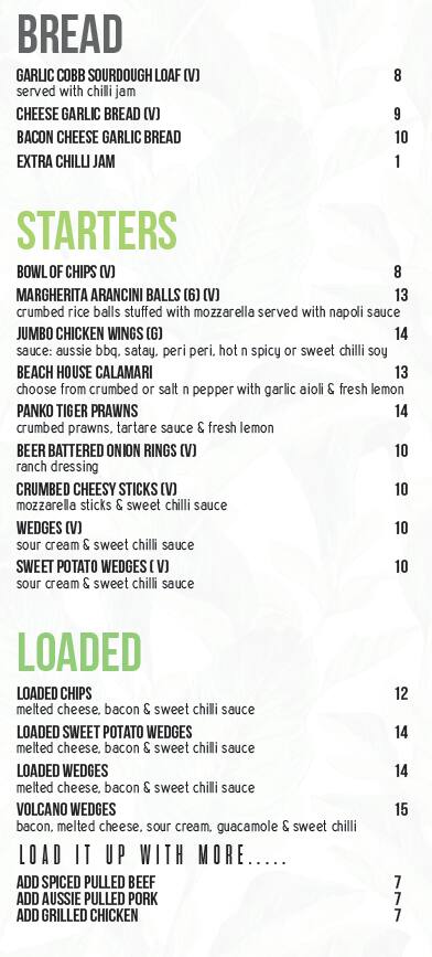 BEACH HOUSE calamari 13 choose from crumbed or salt n pepper with garlic aioli fresh lemon PANKO TIGER PRAWNS double cheddar bbq sauce14 crumbed prawns tartare sauce fresh lemon BEER BATTERED ONION RINGS V 10 ranch dressing CRUMBED CHEESY STICKS v 10 mozzarella sticks sweet chilli sauce WEDGES V salad chips 10. View the online menu of Beach House Grille and other restaurants in Mayodan North Carolina. Beach House Springfield located at Orion Springfield Central is the best place to stop while.